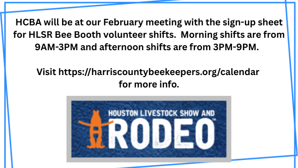 Also, Harris County Beekeepers Association will be attending our February meeting with the Rodeo sign-up sheet. Don't forget to sign up for your shift(s) with the HLSR Bee Booth!